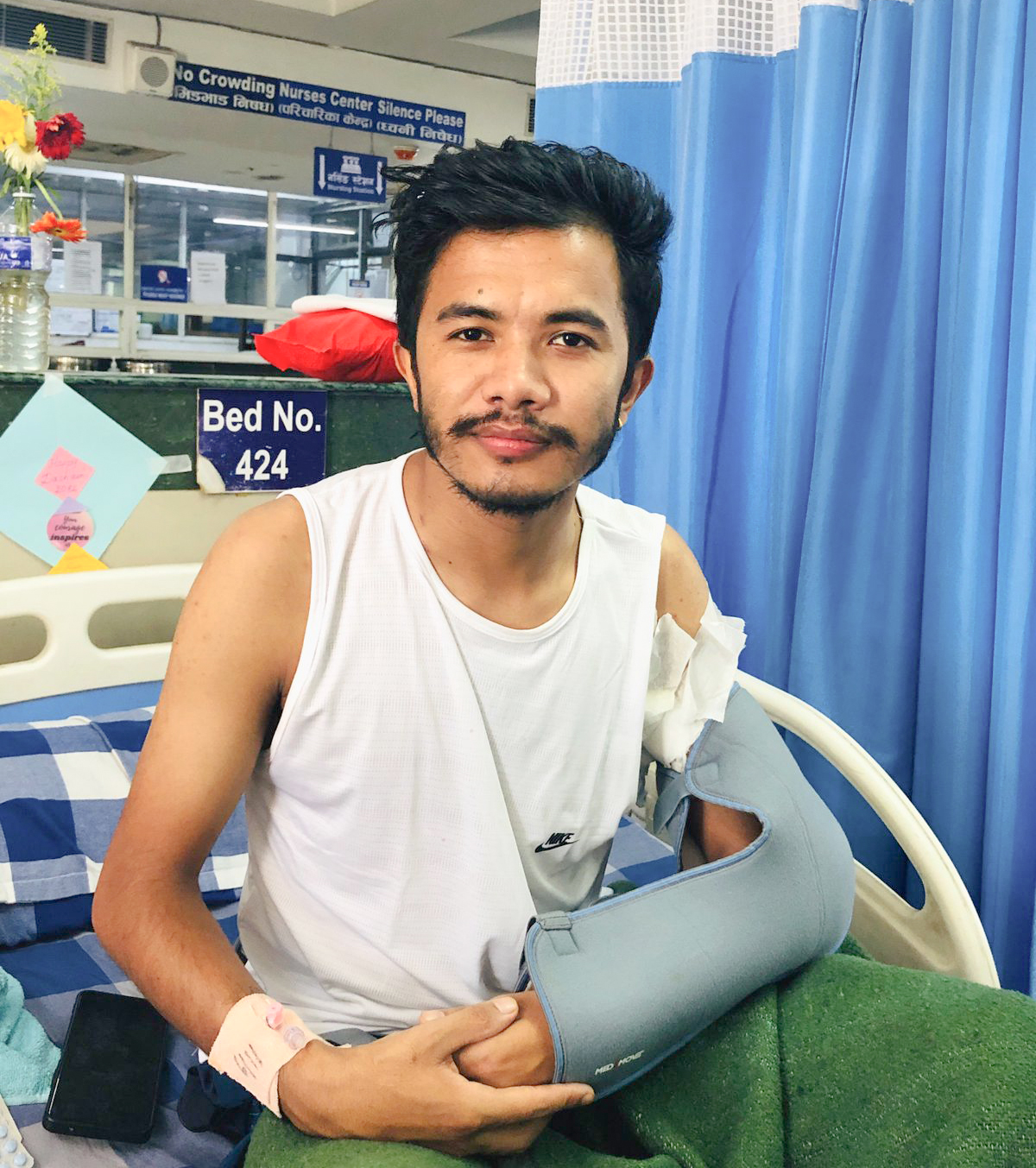 ‘त्यति हुँदा पनि म दौडिएँ, मलाई गोली लाग्यो भनेर साथीहरुलाई भनेँ, रगत ह्वार्र ओइरियो’ उनले सम्झे, ‘त्यो देखेपछि साथीहरुले मलाई उचालेर एम्बुलेन्समा हाले अनि नजिकैको एभरेष्ट अस्पताल पुर्याए।’