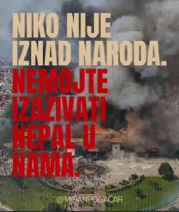 अकस्मात सर्बियाभर एकै शब्द लेखिएका ब्यानर देखिन थाले– नेपाल। सँगसँगै अर्को चेतावनीपनि थपियो- ‘नेपाली जनतालाई झैँ हामीलाई पनि उत्तेजित पार्ने काम नगर।’